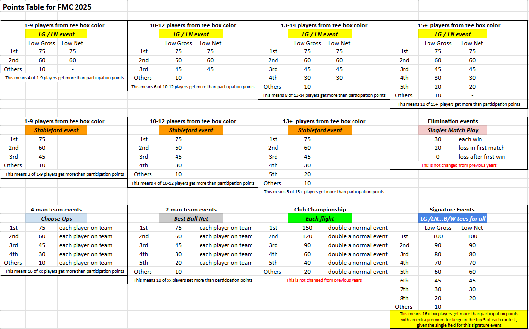 Chart of Points available for each event type, based on the number of players in the event from your tee box that weekend.